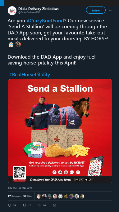 Our first local entry (we’re so proud), last week the Dial-A-Delivery page started posted on twitter about how they apparently be adding a horse delivery option as a fuel saving measure (I’m honestly laughing a little while typing this). The joke actually got some headway on Twitter and seemingly had quite a few people fooled too. The page announced yesterday that it was a joke but again, good move D-A-D, let’s see what you pull off next year.