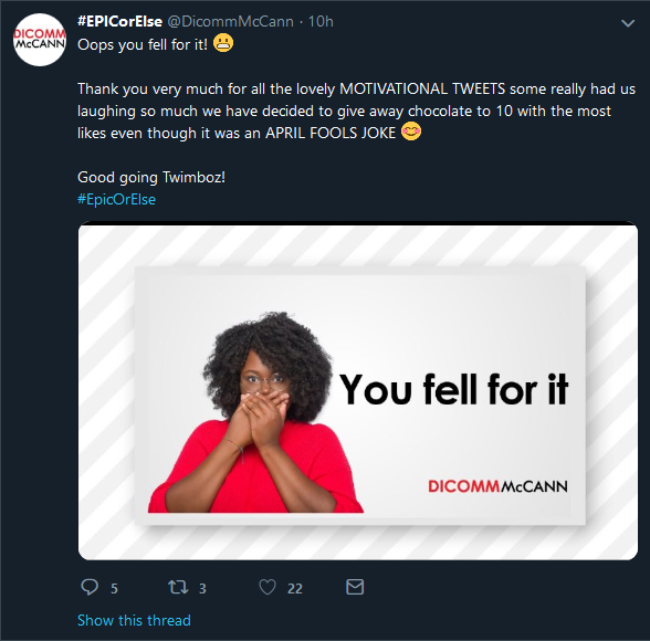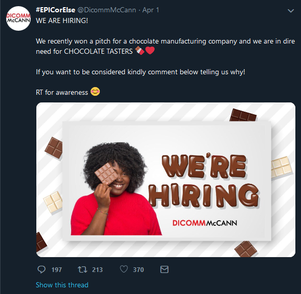 Now if you’re wondering who these guys are, you’re not the only one. But we liked this Zimbabwean brand and marketing firm’s April Fools hoax that we brought them into this list as well. Starting of with a pretty easy to read tweet about needing chocolate tasters, their tweet actually made some reasonable traction on twitter as well (you know how women love their chocolate people) and so much so that in bad April Fools form, the company apparently ended up giving ten chocolates away for real( rule number one of the April Fools accords guys, don’t feel sorry for the people you’re pranking).